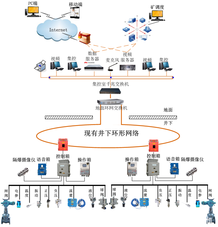 泵房自動(dòng)排水系統(tǒng)主要由PLC控制、預(yù)警與通話(huà)、視頻監(jiān)控和上位機(jī)監(jiān)控平臺(tái)組成。本系統(tǒng)的信號(hào)交互可以依托于礦井已有的以太網(wǎng)絡(luò),也可以自建網(wǎng)絡(luò)系統(tǒng)??刂葡到y(tǒng)采用西門(mén)子S7系列PLC作為核心元件,PLC程序和上位機(jī)監(jiān)控軟件自主研發(fā);預(yù)警與通話(huà)系統(tǒng)由自主研發(fā)的數(shù)字語(yǔ)音報(bào)警器KXH127構(gòu)成,具備開(kāi)車(chē)預(yù)警、故障語(yǔ)音提示、語(yǔ)音對(duì)講等功能。視頻和控制系統(tǒng)均具有網(wǎng)絡(luò)發(fā)布接口,無(wú)論是集控室、礦調(diào)度、其它internet用戶(hù)都可以通過(guò)不同的用戶(hù)權(quán)限登陸訪問(wèn)視頻數(shù)據(jù)和控制數(shù)據(jù)界面。