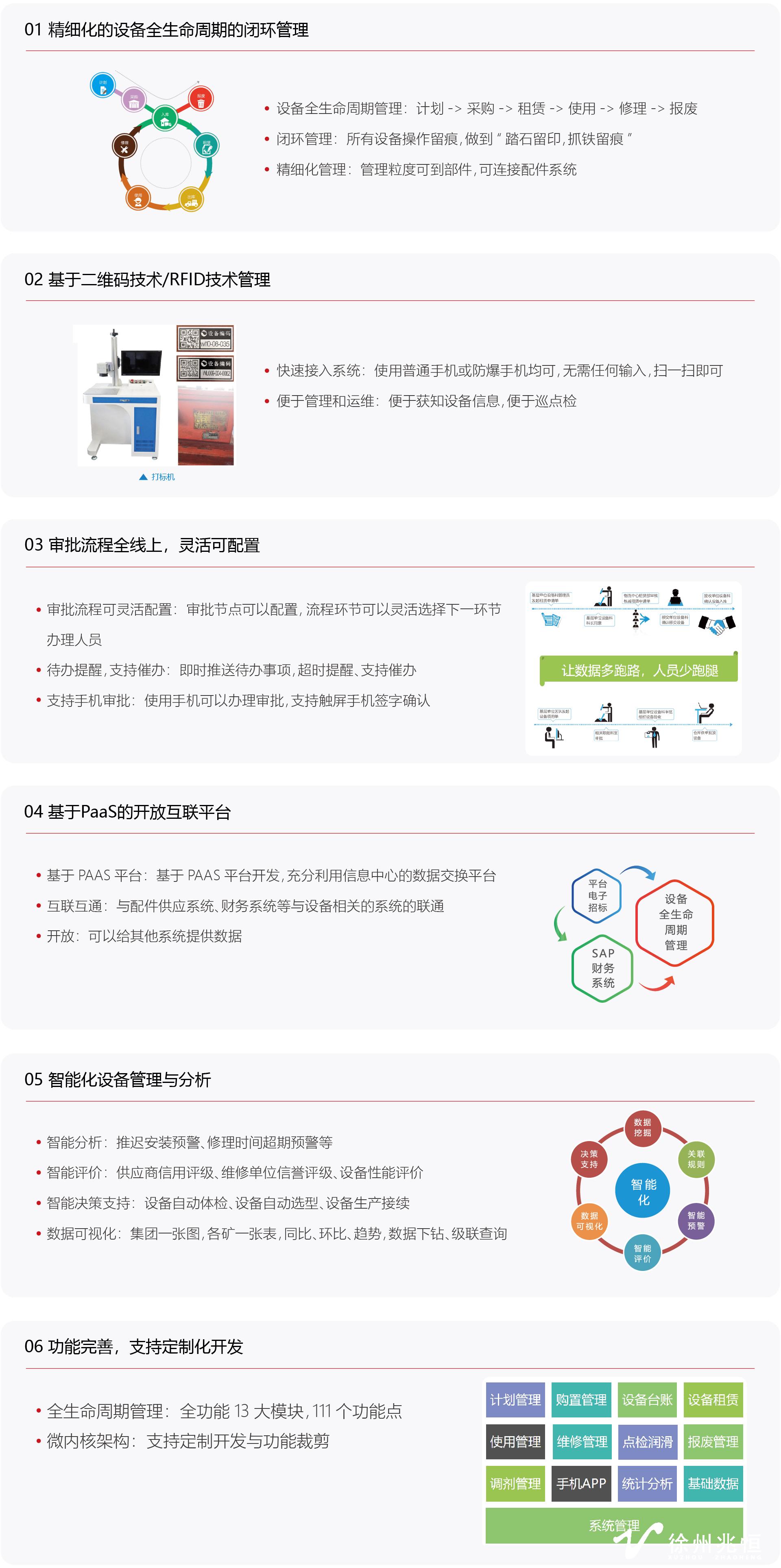 集團公司級設備生命周期管理系統(tǒng)以智能管理數(shù)字化平臺為支撐,采用B/S架構,內(nèi)容涵蓋計劃、采購、合同、出入庫、租賃、維修、點巡檢、報廢、生產(chǎn)接續(xù)、調(diào)劑等關鍵環(huán)節(jié),實現(xiàn)對所有設備進行信息快速識別、采集、記錄、上傳,以及設備的盤點、巡檢、維護信息進行快速的查詢、統(tǒng)計分析等,建立完整、準確的公司資產(chǎn)管理數(shù)字化信息的管理系統(tǒng),提供高效實用的高科技管理手段與方法。