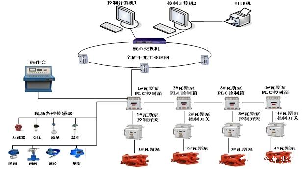 瓦斯抽放泵監(jiān)控系統(tǒng)主要由防爆兼本安型可編程控制箱、本安型操作箱、渦街流量傳感器、管道高濃度瓦斯?jié)舛葌鞲衅鳌⒐艿镭搲簜鞲衅?、管道溫度傳感器、泵房環(huán)境瓦斯?jié)舛葌鞲衅?、電流傳感器、缺水傳感器、監(jiān)控計算機和UPS電源等組成??蓪崿F(xiàn)瓦斯超限報警、設(shè)備故障報警、參數(shù)實時顯示等功能。
