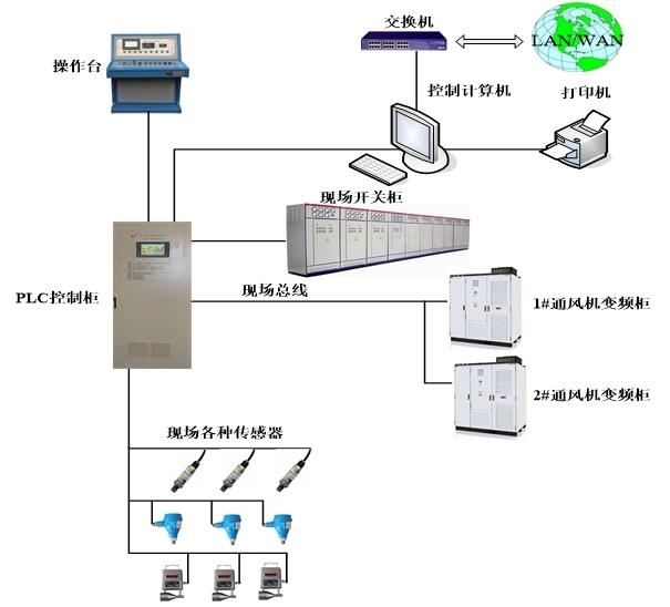 本系統(tǒng)主要由PLC控制柜、工控機(jī)、監(jiān)測(cè)傳感器、遠(yuǎn)程監(jiān)控計(jì)算機(jī)和信息傳輸網(wǎng)絡(luò)等組成。PLC結(jié)合工控機(jī)對(duì)主扇及附屬設(shè)施進(jìn)行控制,實(shí)現(xiàn)自動(dòng)控制和一鍵倒機(jī);遠(yuǎn)程監(jiān)控計(jì)算機(jī)設(shè)置在礦調(diào)度,可以實(shí)現(xiàn)對(duì)風(fēng)機(jī)的遠(yuǎn)程控制和運(yùn)行參數(shù)顯示等功能;視頻監(jiān)控是本系統(tǒng)的重要組成部分,實(shí)時(shí)顯示現(xiàn)場(chǎng)環(huán)境。系統(tǒng)內(nèi)PLC及工控機(jī)均帶有網(wǎng)絡(luò)功能或配有網(wǎng)絡(luò)模塊,可以將本監(jiān)控系統(tǒng)信息接入全礦井綜合自動(dòng)化系統(tǒng)中。