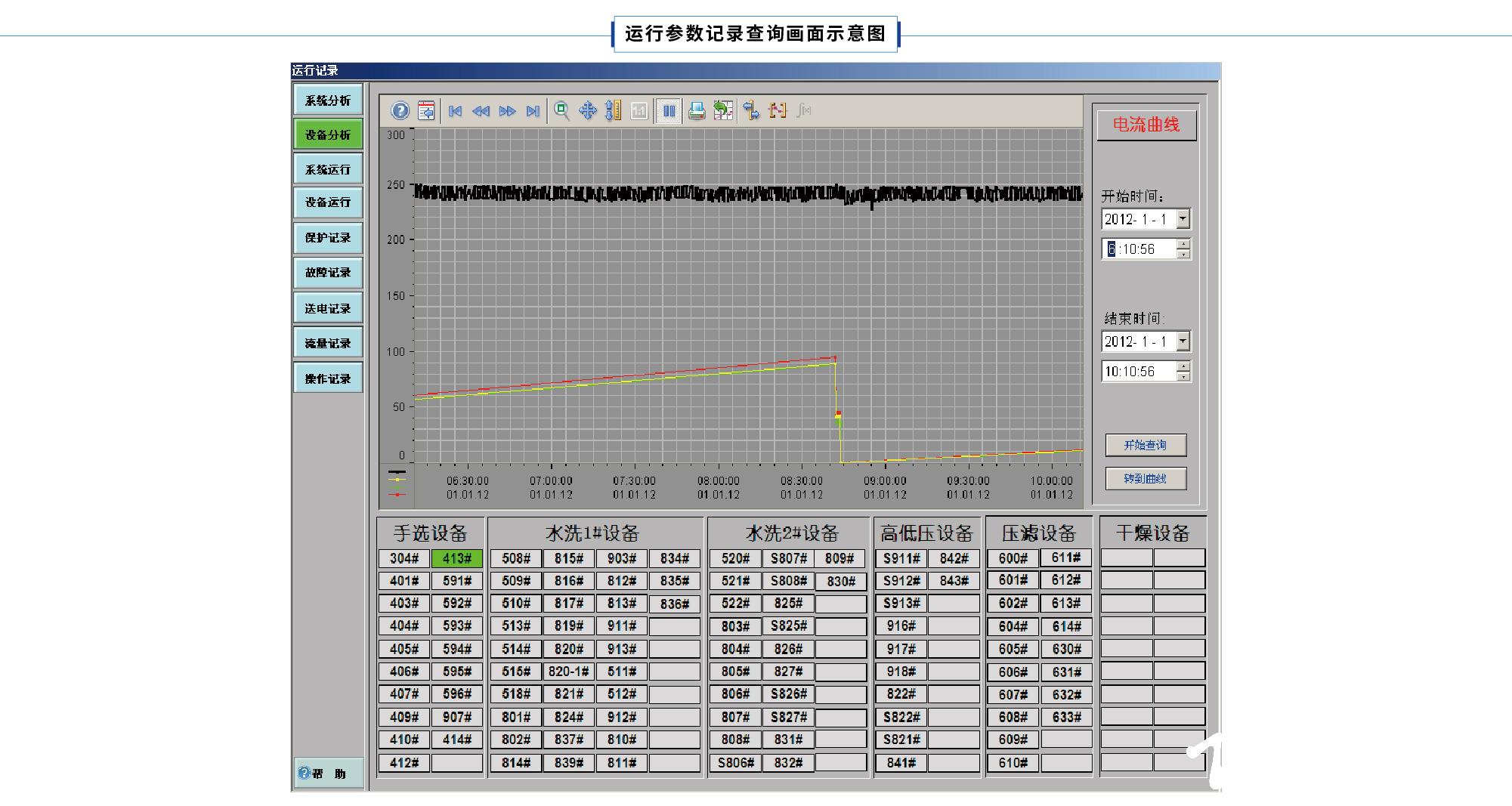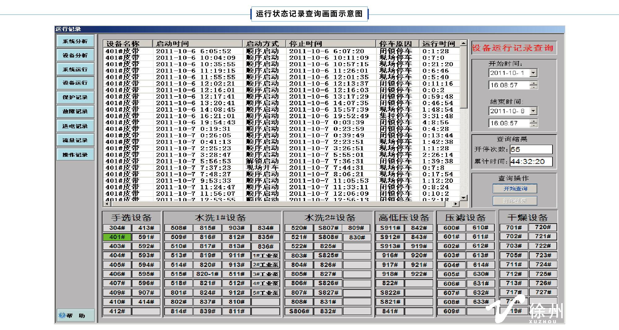 14)設(shè)備運(yùn)行記錄:實(shí)時(shí)記錄設(shè)備的開停狀況,能查詢1年內(nèi)的設(shè)備的開停情況,并自動(dòng)累計(jì)運(yùn)行時(shí)間,開停次數(shù)等。記錄內(nèi)容包括:設(shè)備名稱、開車時(shí)間、開車方式、停車時(shí)間、停車原因、運(yùn)行時(shí)間等。