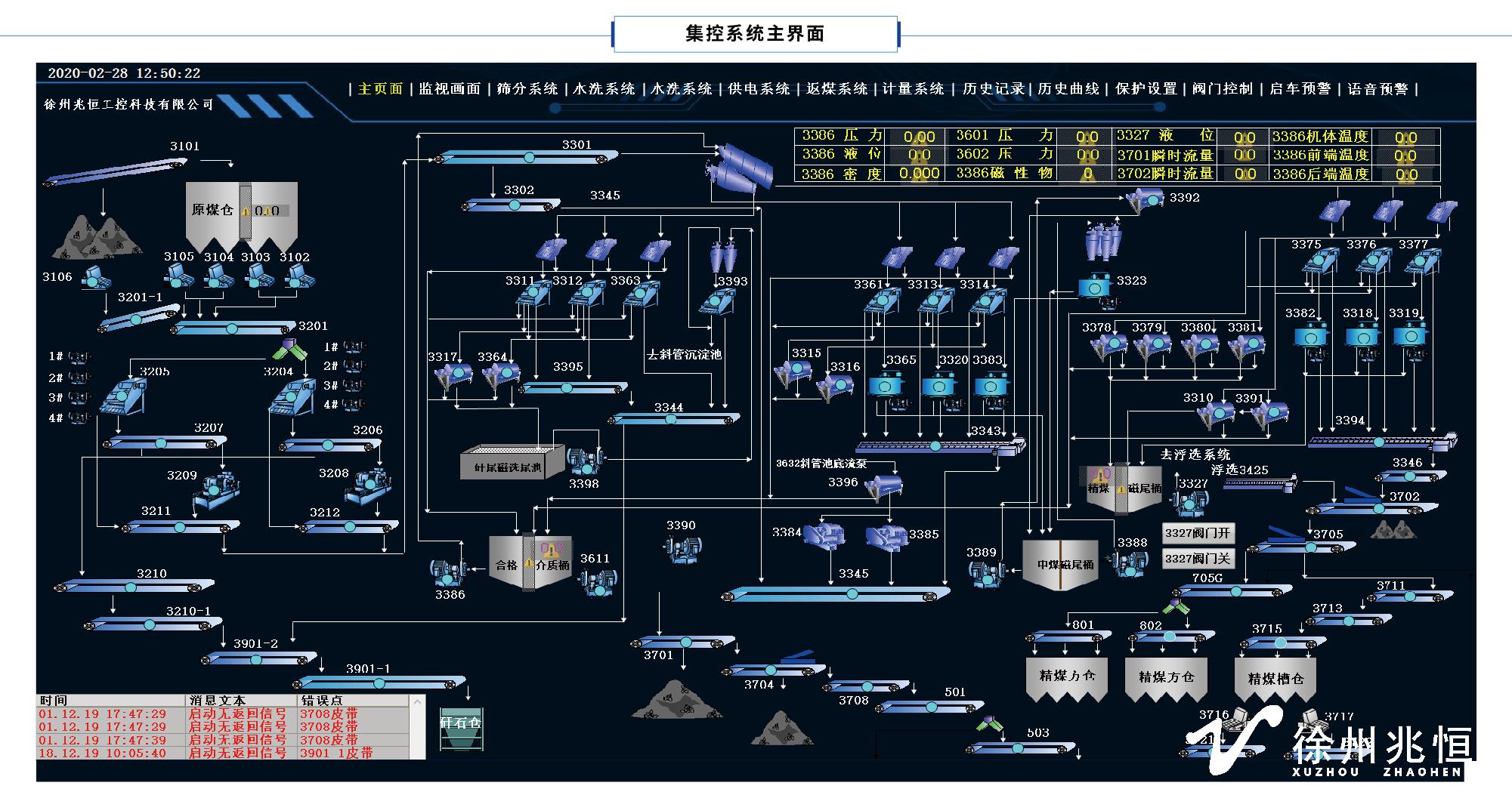 1)選煤廠全部設(shè)備集中控制:在選煤廠各車間設(shè)置PLC控制柜,各PLC控制柜通過工業(yè)以太網(wǎng)將信息匯集到集控室;根據(jù)監(jiān)控需求,在現(xiàn)場(chǎng)安裝各種監(jiān)測(cè)傳感器,并通過無線或有線的方式就近接入PLC控制柜;在控制與調(diào)度室配置集控計(jì)算機(jī)、大屏顯示、數(shù)據(jù)服務(wù)器等設(shè)備,實(shí)現(xiàn)對(duì)選煤廠生產(chǎn)過程的控制與調(diào)度;現(xiàn)場(chǎng)設(shè)備啟停預(yù)警與通話系統(tǒng)是集控系統(tǒng)的組成部分,