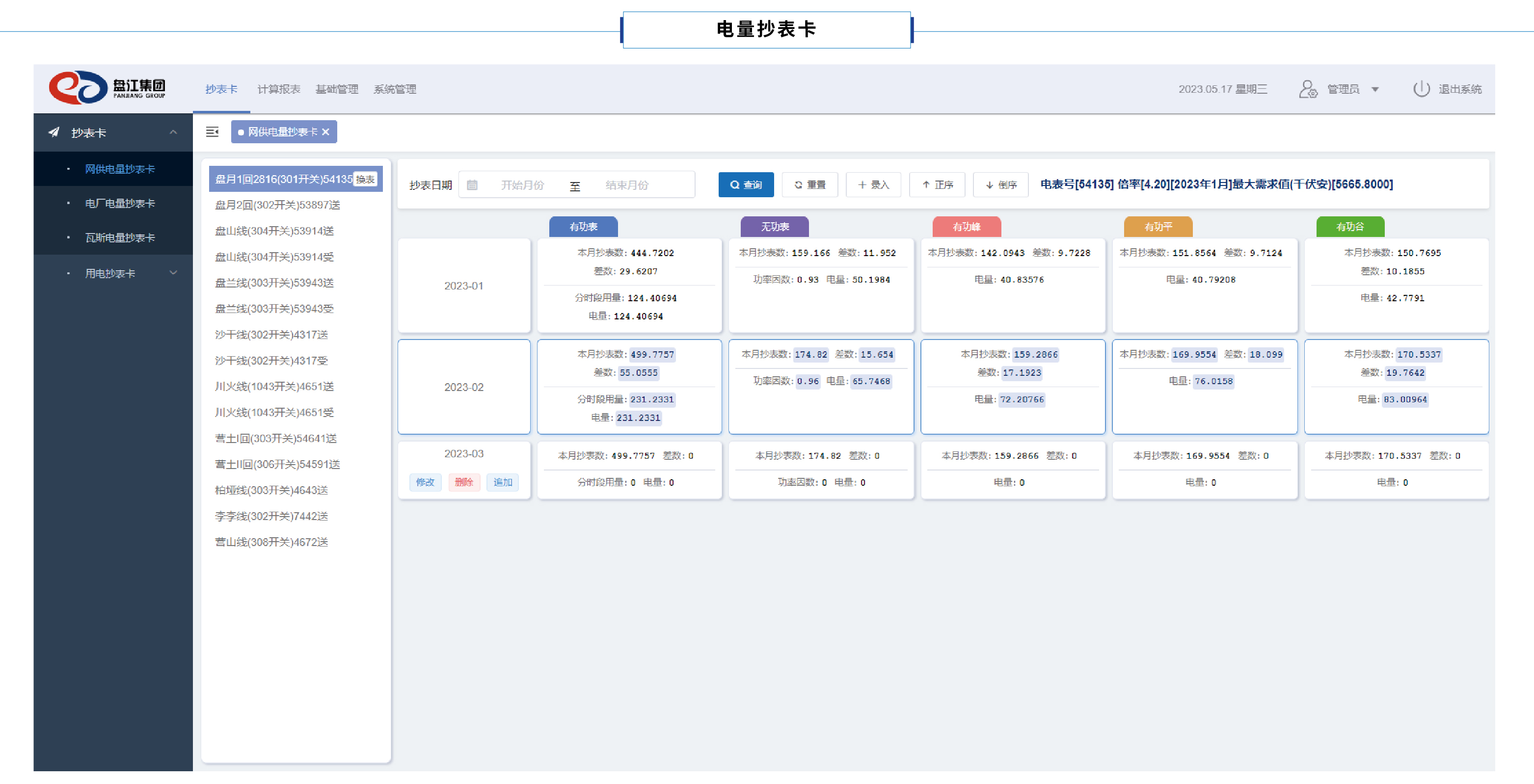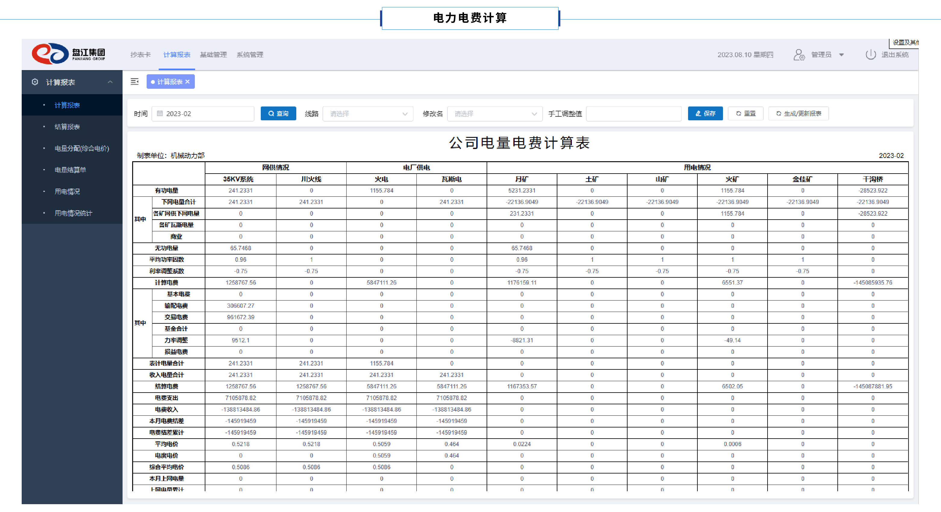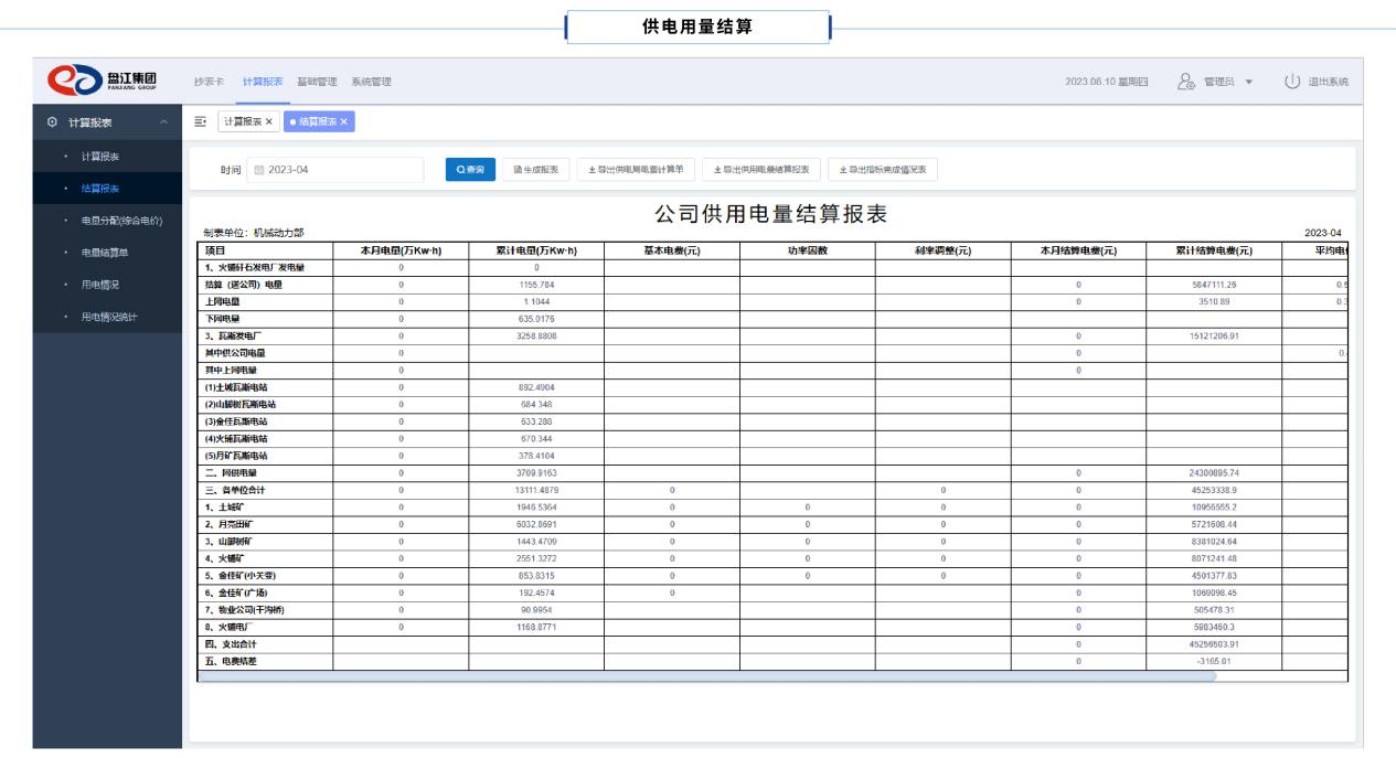 電量電費計算報表包含國網公司供電電量、電廠發(fā)電量數據,涵蓋有功電量、無功電量、力率調整系數、計算電量、結算電量、電費支付、月度電費結差、累計電費結差的數據報表。