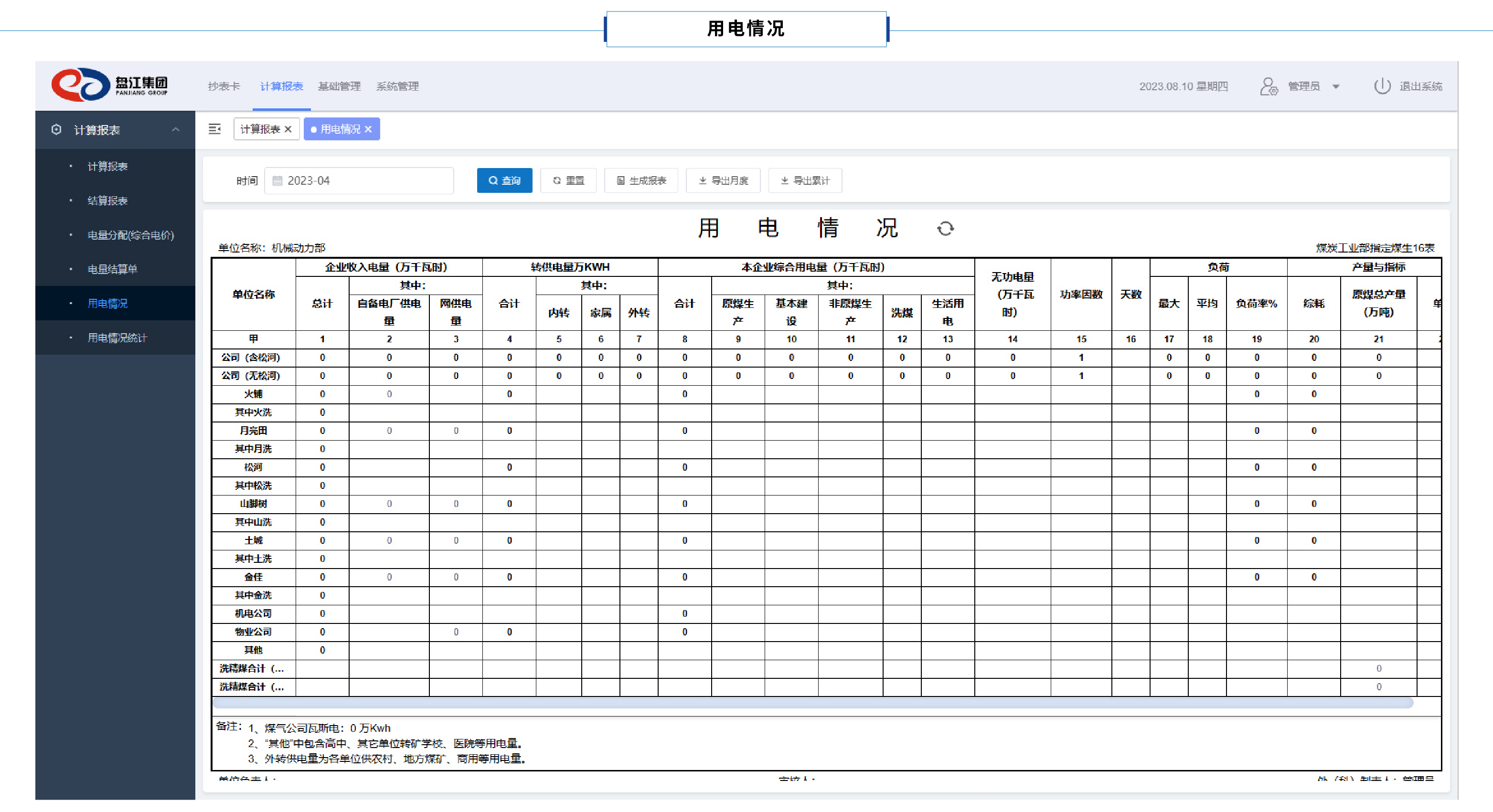 用電情況報表即煤炭工業(yè)部指定煤生16表,對各用電單位的企業(yè)收入電量、轉供電量、企業(yè)綜合用電量、無功電量、功率因數、天數、最大負荷、平均負荷、負荷率、綜耗指標、原煤總產量、單耗等數據進行一鍵計算,生成指定時間段的數據報表。