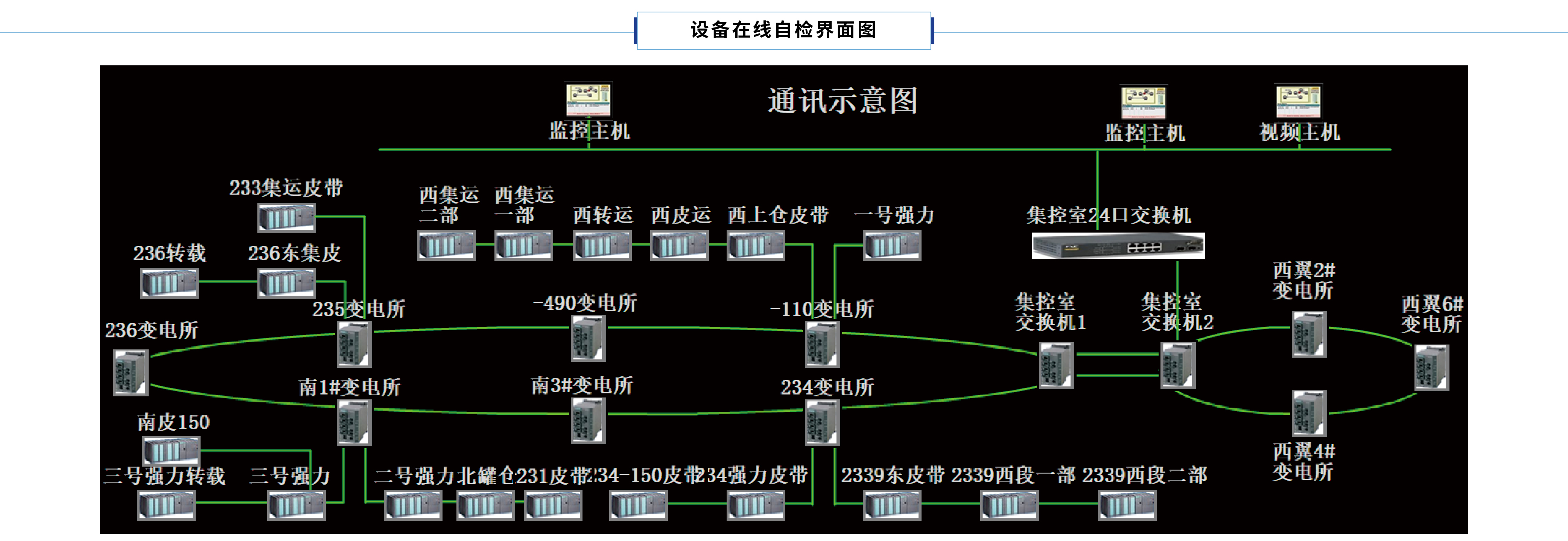 當(dāng)前,主運(yùn)輸集控系統(tǒng)涉及設(shè)備較多,包括主控PLC、環(huán)網(wǎng)交換機(jī)、節(jié)點(diǎn)交換機(jī)、設(shè)備控制分站、數(shù)據(jù)采集分站、視頻攝像頭、地面服務(wù)器、計算機(jī)、沿線語音終端等,任何一個設(shè)備斷電或者由于其他故障導(dǎo)致設(shè)備離線,都將影響整個主運(yùn)輸系統(tǒng)或局部功能的正常運(yùn)行,甚至造成系統(tǒng)宕機(jī),影響主運(yùn)輸系統(tǒng)的正常開停,造成重大損失。因此,本系統(tǒng)實(shí)現(xiàn)對控制系統(tǒng)主要設(shè)備的全面實(shí)時自檢 。