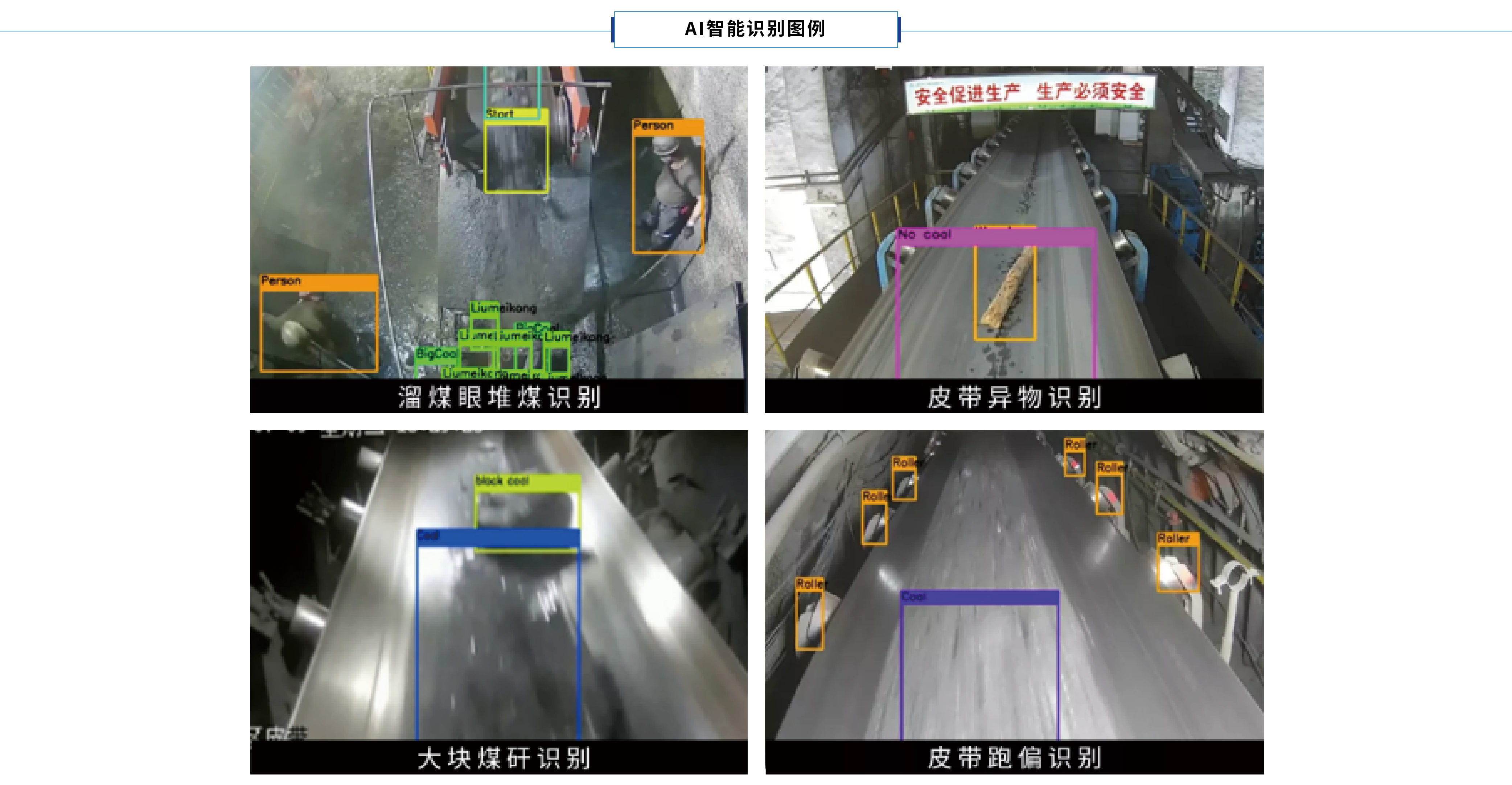 4)利用AI視頻技術(shù),實(shí)現(xiàn)煤流量、異物、人員行為、堆煤、跑偏、撕裂的識別、抓拍和報警。